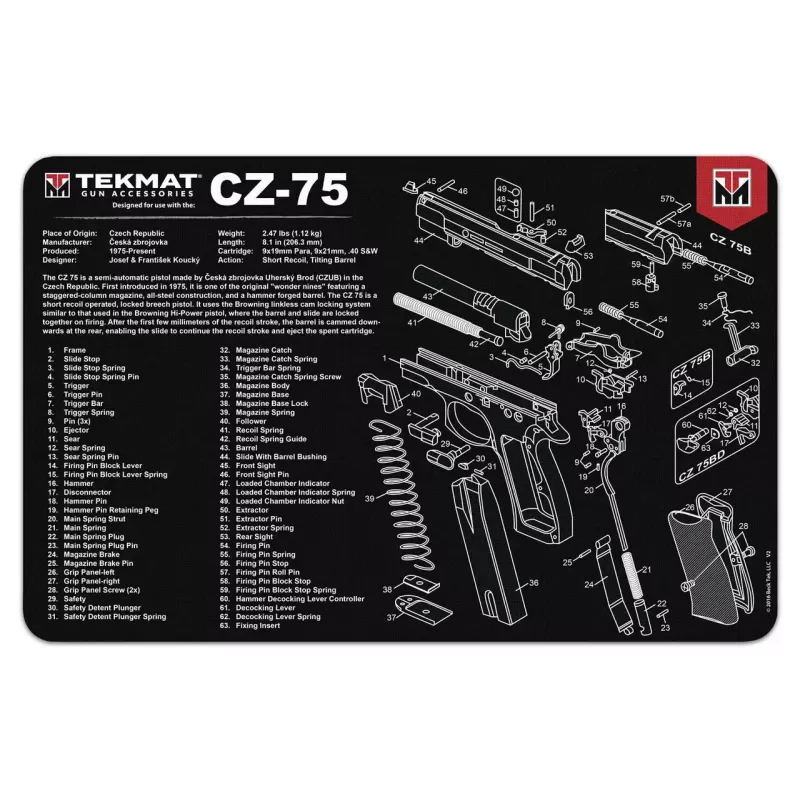 Originálna podložka TekMat s potlačou ČZ 75 na čistenie a údržbu zbraní. Tieto 17" (43cm) podložky TekMat sú dostatočne veľké, aby sa na ne zmestila plne rozobraná pištoľ a zostalo miesto na náradie a príslušenstvo.
