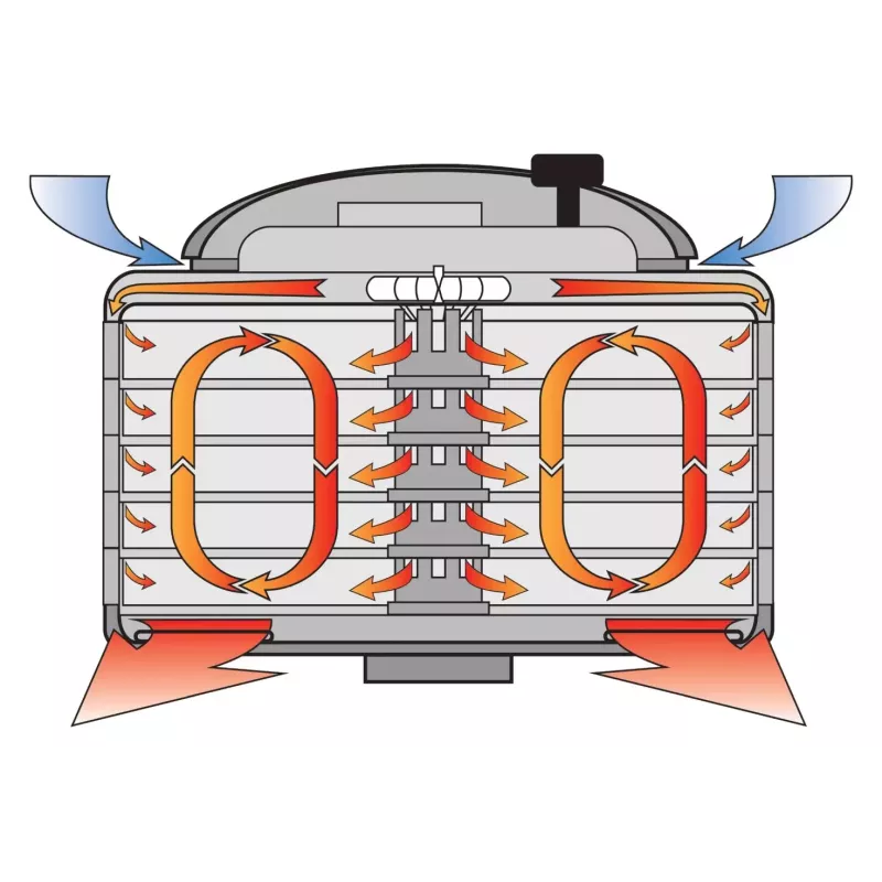 Výkonný 500W vykurovací systém ohrieva vzduch rýchlo a rovnomerne, čo skracuje dobu sušenia. Konštrukcia s núteným prúdením vzduchu zaisťuje, že teplo a vzduch sú rovnomerne rozvádzané po jednotlivých poschodiach, čím sa nábojnice vysušia vo vnútri aj zvonku. Ventilátor umiestnený hore zaisťuje, že sa v obvodoch nehromadí vlhkosť po čistení. Sušiace tácky majú jemné mriežkované dno a záchytné rebrá, ktoré udržujú nábojnice oddelené v rôznych vrstvách.