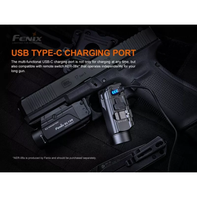 Nabíjateľné taktické LED svietidlo Fenix GL19R je skonštruované špeciálne pre použitie na krátkych zbraniach a v kombinácii s diaľkovým spínačom AER-06S je možné ju použiť aj na dlhej zbrani. Ponúka špičkový výkon svetla 1200 ANSI lúmenov s dosvitom až 210 metrov. Svietidlo je napájané jedným Li-ion akumulátorom Fenix 18350 ARB-L18-1100P, ktorý sa nabíja cez USB-C konektor priamo vo svietidle. Zjednodušené ovládanie svietidla je obojstranné (pre pravákov aj ľavákov). V prípade potreby je možné svietidlo prepnúť do nižšieho výkonu 350 lúmenov alebo ho možno okamžite prepnúť do stroboskopického blikania. Montáž na lištu je jednoduchá a nevyžaduje náradie - svietidlo sa nasunie na zbraňovú lištu a zaistí páčkou. Je možné ho pripevniť na zbraňové lišty štandardu Picatinny MIL-STD-1913 a GLOCK (nemusí pasovať na zbrane z kategórie slimline, napr. model Glock 30). Svietidlo je vhodné pre profesionálov, športových a hobby strelcov aj airsoft.